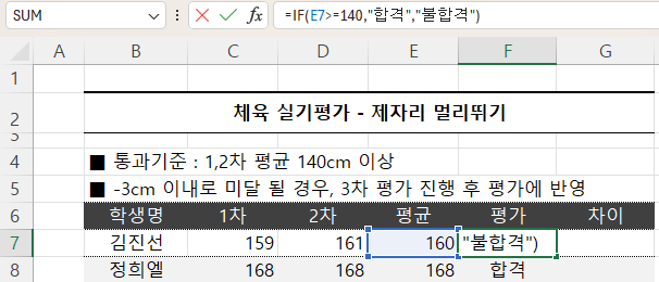 조건으로, 평균인 160이 있는 셀 E7이 합격기준인 140보다 크거나 (>) 같다 (=)