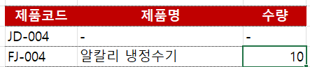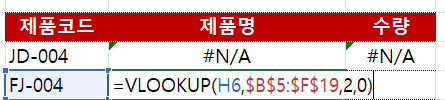 제품코드 입력이 잘못 되어 오류 값으로 #N/A가 나오고 있다.