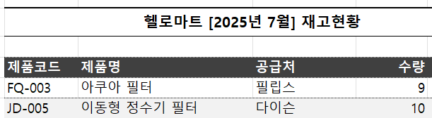 예를 들어, 이렇게 재고현황 데이터가 있고