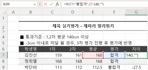 ■ 불합격이 -3cm 이내 미달 될 경우 재시험본다고 했기 때문에, if함수로 차이 계산