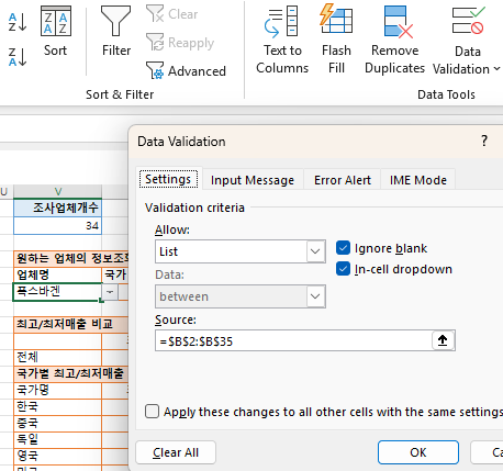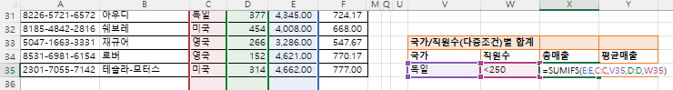 세 번째 인수에 국가 조건을 입력한 v35셀을 입력한다.