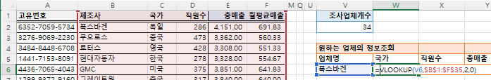 아래 표처럼, 찾을 값인 제조사명 범위는, 지정한 범위 중 맨 왼쪽에 위치해 있다.