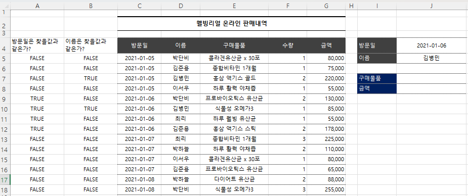 A열에는 방문일 열이 찾을 값의 방문일과 같은지 물어보고