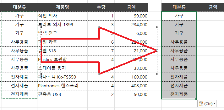 range 조건 범위를 드래그 한다. (예시에서는 판매현황 표의 대분류 범위 열을 선택)