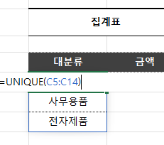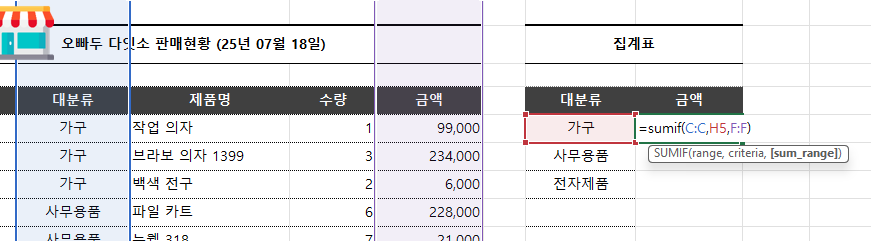 ⓑ sumif를 사용해서 대분류 조건을 만족하는 금액을 구하자!
